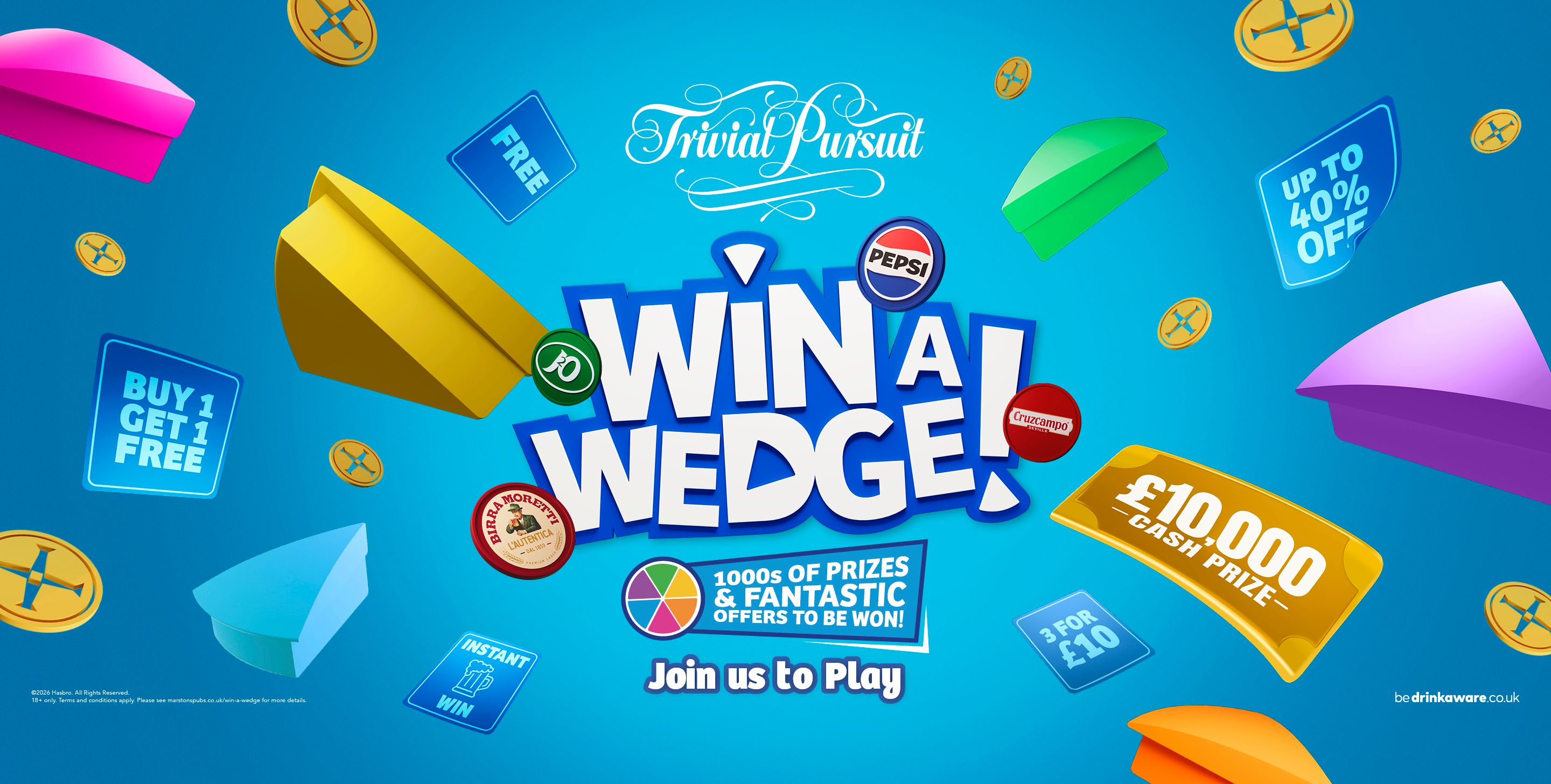 Scan the QR code in pub to play. Answer all 6 Trivial Pursuit questions correctly for an instant reward or fantastic offer. And here’s the best bit… win or lose, you could win £10,000.